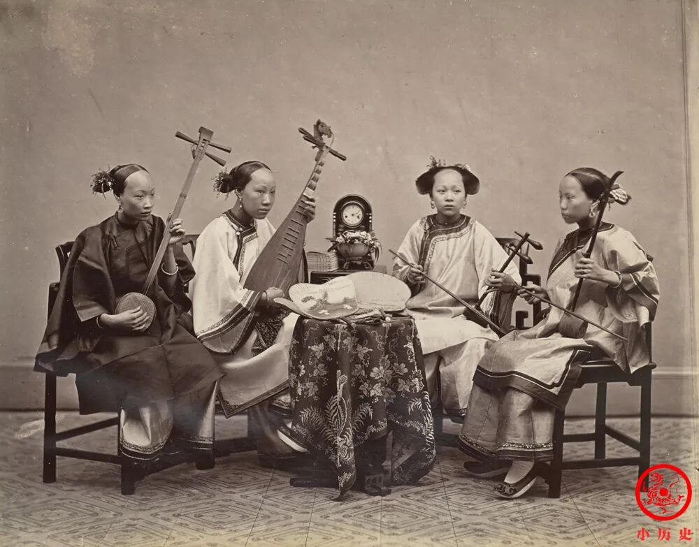 她们发型不一,服装类似,右一那位穿登云履。你认识她们手里的乐器吗?