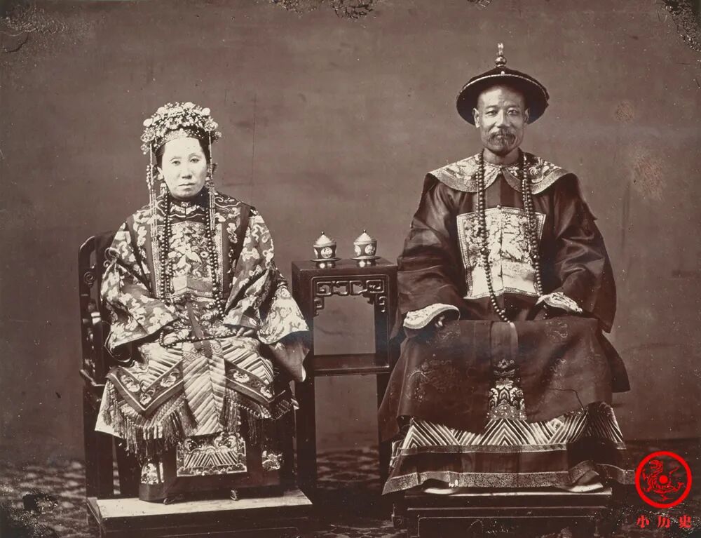 根据官服上的白鹇补子判断,这名文官为五品。清朝五品文官官帽饰小蓝宝石上衔水晶石,年俸80两白银、80斛禄米,另外有养廉银2400两。他的妻子已被朝廷封为诰命夫人。