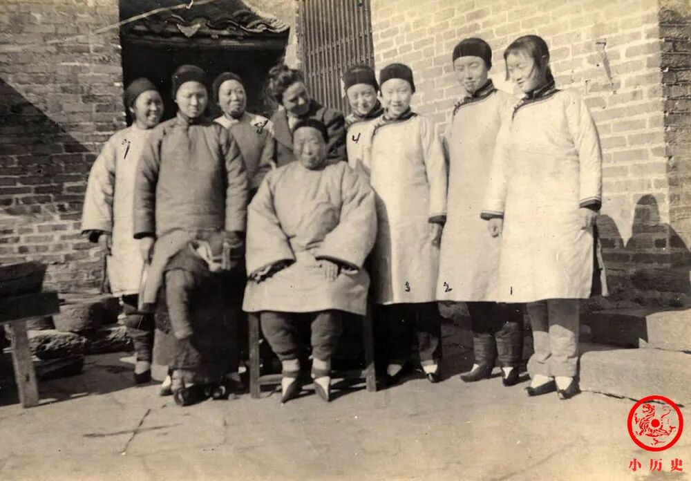 当地女人都裹着小脚,右侧那几位年轻人也这样,可见海州百姓的生活还保留着传统的习惯。不过,她们身上也有时尚元素,即她们所穿的袄子,不再是宽袍大袖,而变得紧身,更能显示纤细的身材。