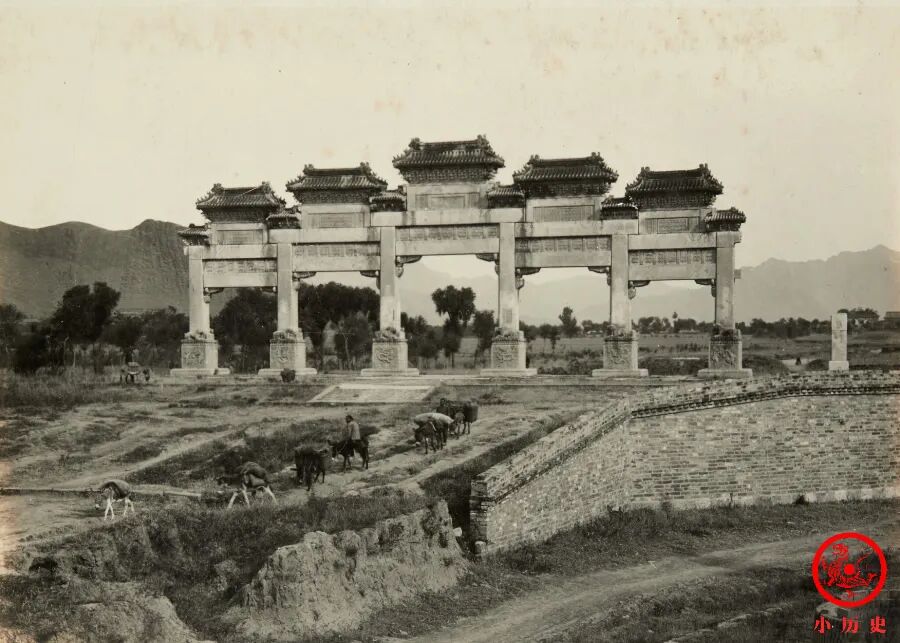 石牌坊是十三陵最前端的领头建筑,宽28.86米,高14米,规模庞大。坊下有男子驱赶着一队毛驴通过,可能是到陵区种田的农民。清廷在十三陵设有管理人员,不允许在里面种田,实际上管理十分松懈,种田、伐木等现象有禁无止。