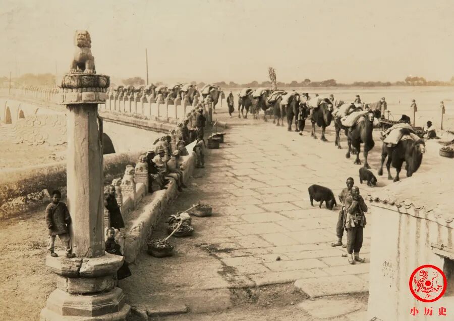 卢沟桥与京城广安门之间,有一条石板路相连,路上不全是车水马龙,驼队才是最常见的。城里城外运送货物全靠骆驼,可谓“骆驼不绝于途,驼铃不绝于耳”。另外,皇帝拜谒西陵和去南方巡视,卢沟桥也是必经之地。