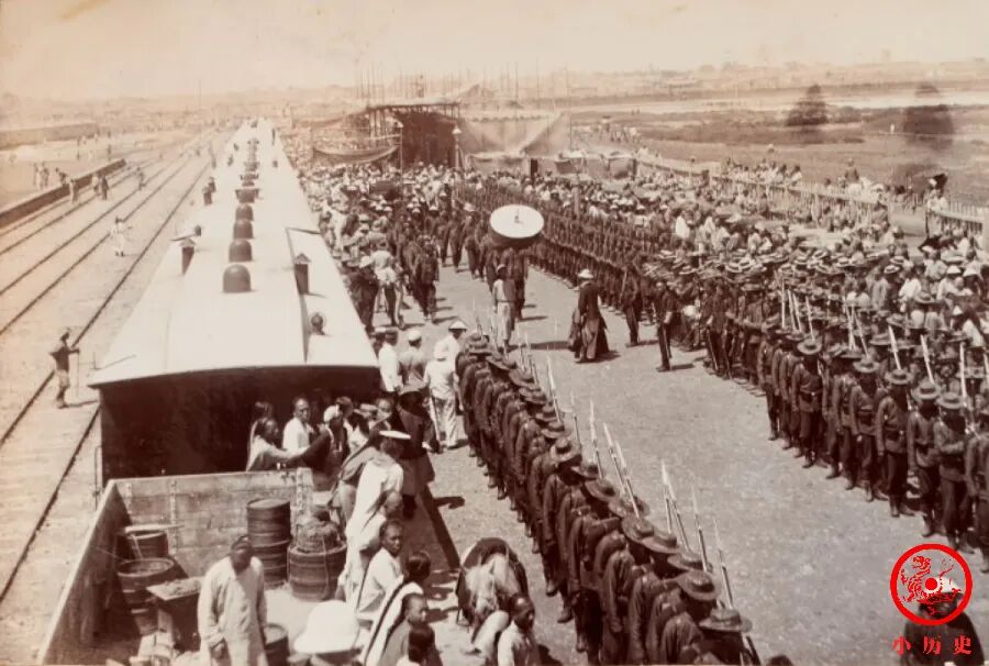 站台上有清军持枪列队,中间以伞盖打头的队伍缓缓走来,场外围观者甚众,一时间喧嚣热闹、人山人海。显然,这是迎接大人物驾到的场景。
