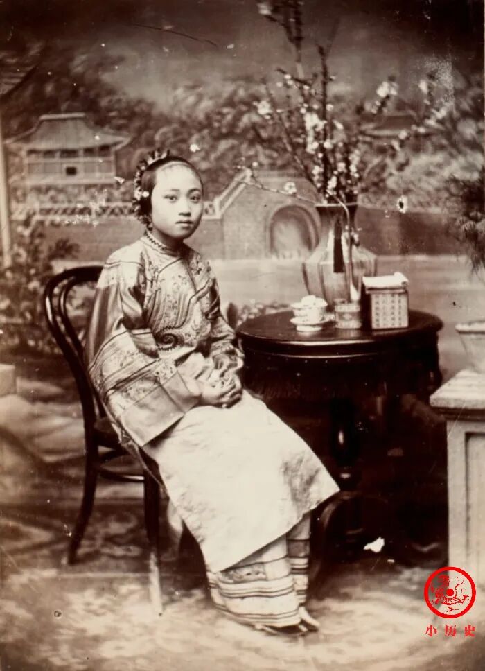 这位年轻的女子是大户人家的小姐,装束精致,气质优雅,落落大方,当是很多青年男子追求的对象。她的美不仅体现在她的长相,还体现在她的“三寸金莲”。在那个时代,人们还愚昧地认为缠足很美,甚至有些地区不缠足的姑娘找不到婆家,其实是一种畸形的审美观。