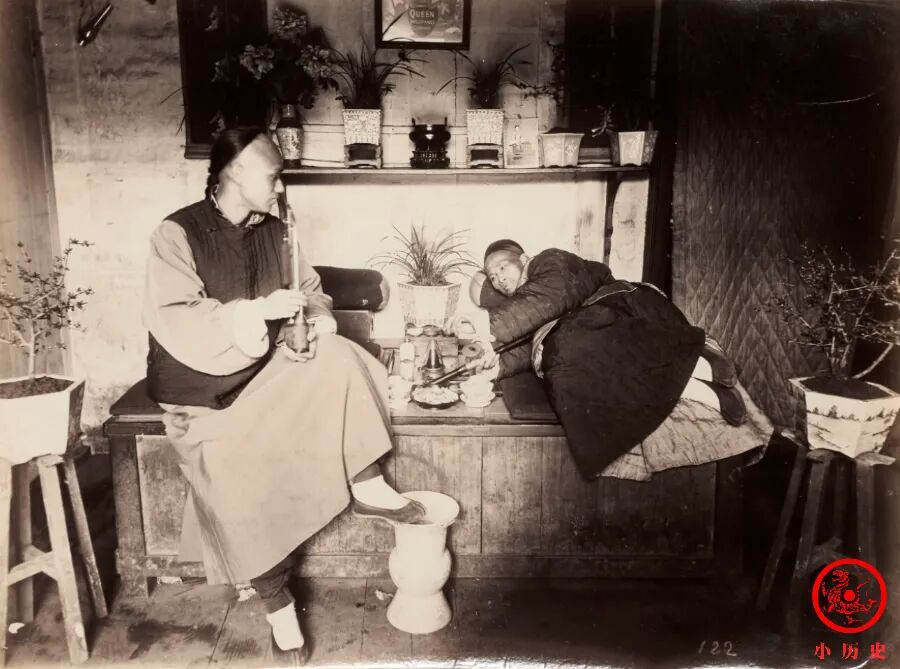 两个男子缠绵在烟榻之上,左边那位抽水烟,右边那位正在抽鸦片。晚清文人彭养鸥这样描写当时鸦片泛滥的情景:“到了夜间,东也一张烟榻,西也一个烟铺,烟灯点得透亮,一星星倒像鬼火。”