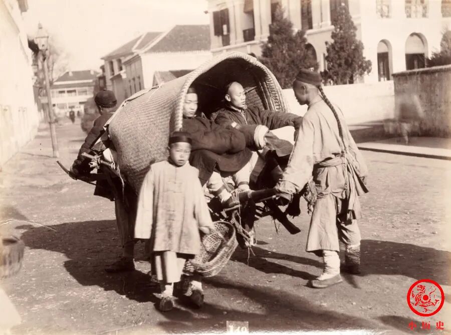 清朝时期无论在城市还是乡村,独轮车都被广泛应用,即可运货,也可载人。城里有专人做这一行的生意,车夫在路口等待,像出租车一样,为有需求的顾客提供服务。照片中这辆车加了顶棚,看来是专门拉人的。