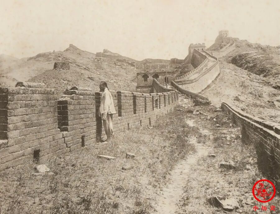 画面中的长城位于北京附近,或许就是八达岭那一段。由于缺乏修缮维护,女墙多处破损,但整体上还是完整的。那个男子站在堞口,看到的只有光秃秃的山体。那时候人们没有保护生态环境的意识,砍伐树木比较严重,导致山上几乎没有植被覆盖。