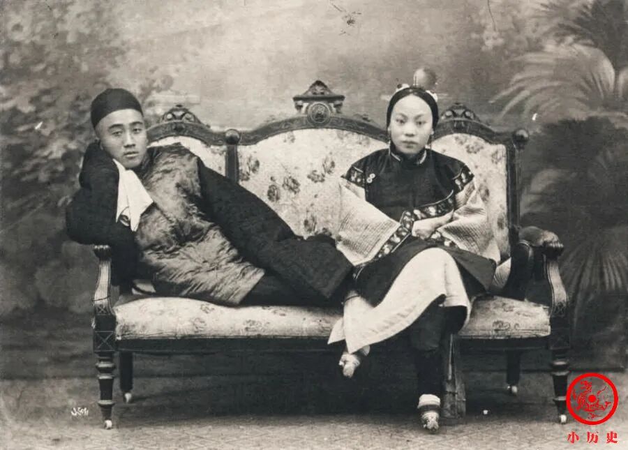 一对年轻夫妻在卧榻之上拍合照,感情甜蜜。夫妻合照不少见,但大多都是正襟危坐、分开而坐,像他们俩这样有肢体接触的实属难得一见。那个时代相对比较保守,夫妻之间表达感情比较含蓄,更不会在外人面前有亲密接触。