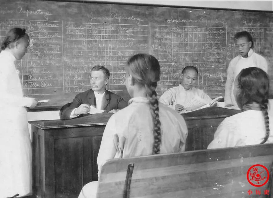 拖着大辫子、穿着长衫的年轻人,到外国人办的大学接受新式教育,多多少少有一点违和感。那个新生和外国老师虽然处于同一画面之中,但他们仿佛来自不同的世界。