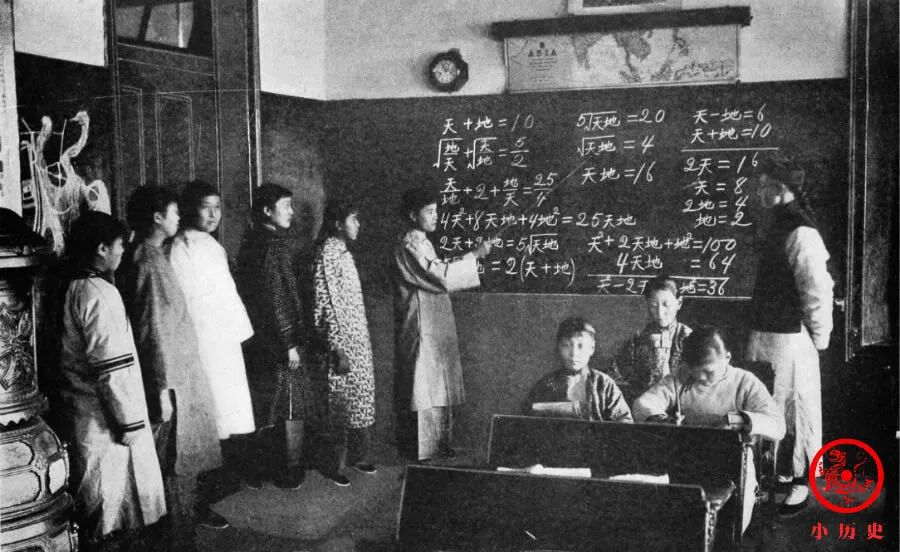 我们来看看黑板上的算式,天、地代表未知数,天+地=10,天-地=6,可以算出天=8、地=2。这节课是在讲授方程式。清朝私塾教育只有四书五经,没有数学,新式学堂出现之后才开始安排数理化课程。