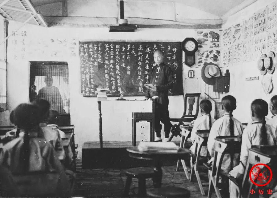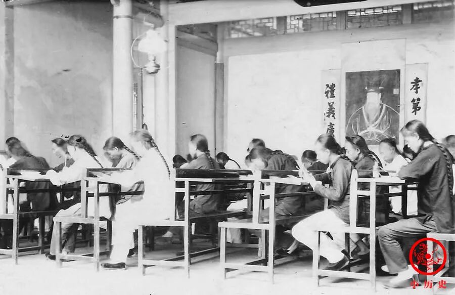虽然是新式学堂,教室里挂着大幅孔子画像,仍然祭拜孔子,以体现尊师重教。