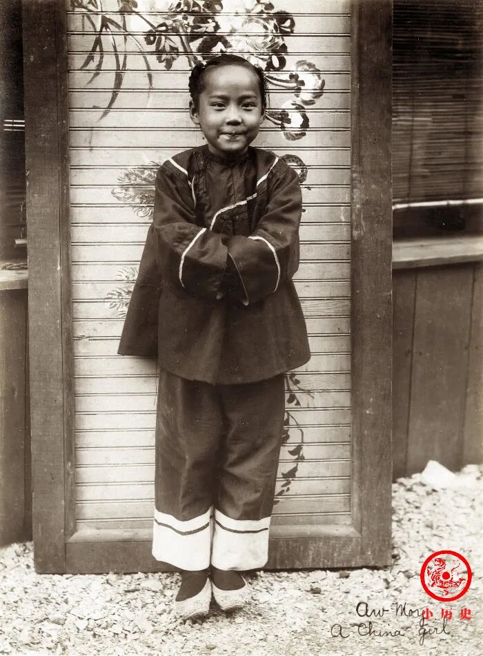她憋着笑,面对镜头毫不怯场,是一个很可爱、开朗的小女孩。这时候她还是天足,可以奔跑跳跃,畅享童年的快乐,但愿她在以后的成长过程中没有遭到缠足的摧残。“三寸金莲”让一个鲜活的女人变成困守闺房的病猫。