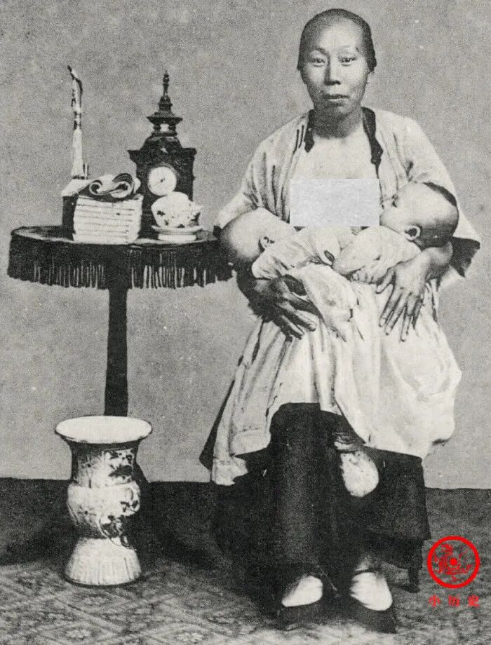 奶妈用自己的奶水喂养别人家的孩子,从中得到一定报酬,然而她自己的孩子却只能以米汤为生,甚至一年时间都不能与自己的孩子相见。这就是这个职业违背人伦之处。照片中奶妈抱着一对外国双胞胎在哺乳,可能是应主家之要求而拍摄。