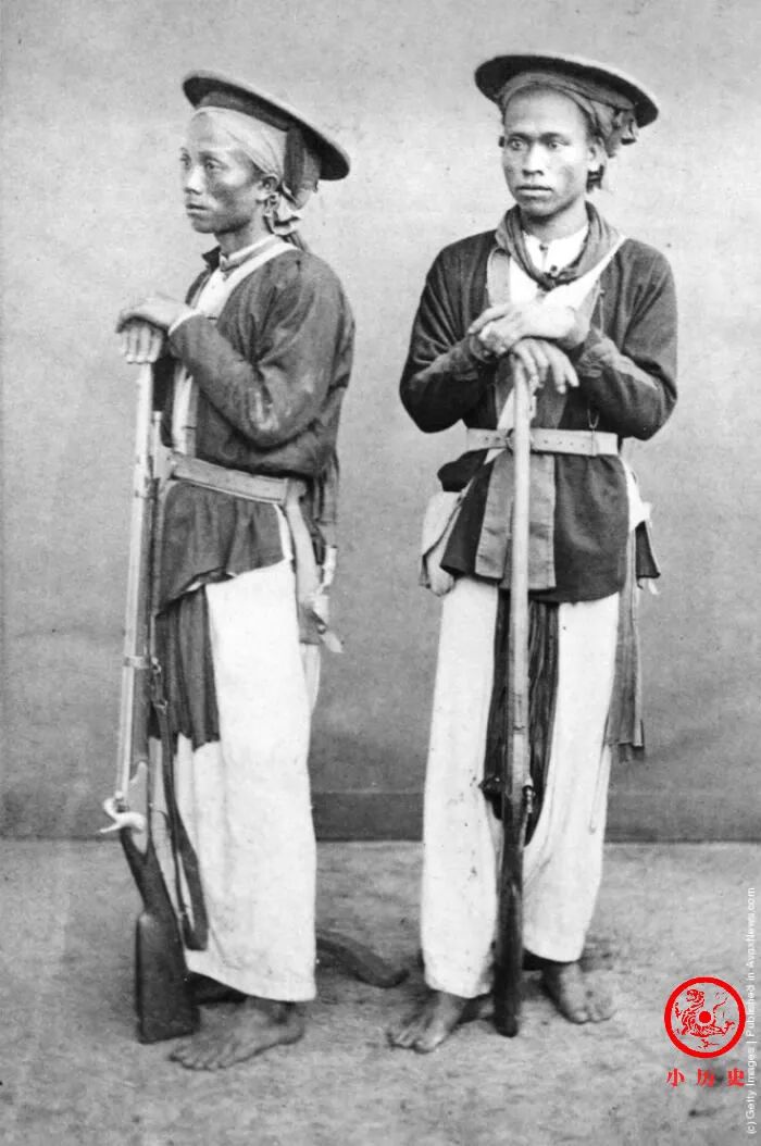 晚清时期几乎每个地方都编练了地方部队,但是他们往往疏于训练,纪律废弛,战斗力低下,真正上战场会不堪一击。就如照片中这两位,双手搭在枪口上,很不专业;脚上不穿鞋,军容不整。