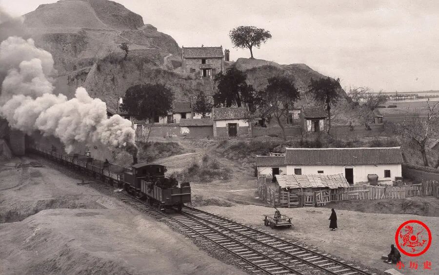 这是一辆在京汉铁路(1906年开通)上奔驰的货运列车,地点位于黄河大桥附近。那时候的火车机车是蒸汽动力,要烧煤,所以车头冒出滚滚浓烟。我们在影视剧中经常可以看到此类场景。