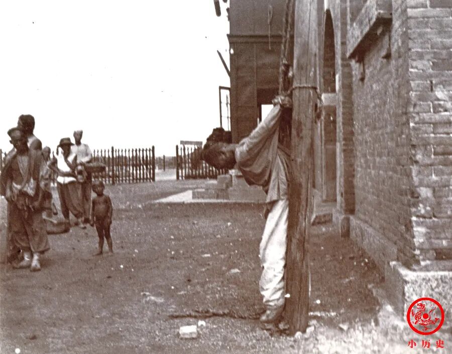 男子偷东西落网,双手被反绑在柱子上,遭到了公开惩罚。不知是当地官府的判罚,还是失盗的户主私自体罚?后者在那个时代也是允许的。