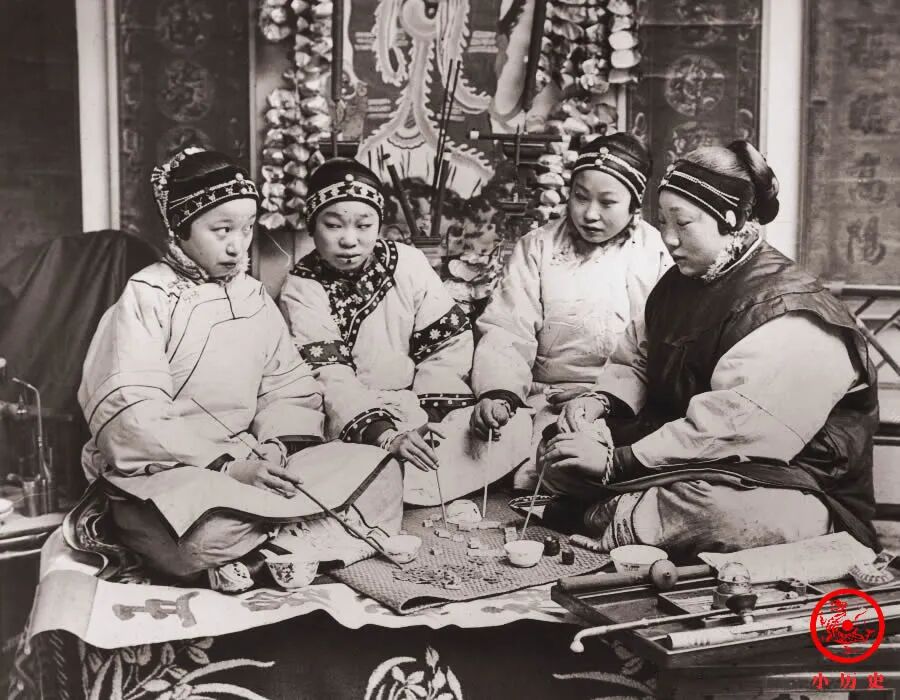 四位妇女衣着讲究,其身份不难猜测,肯定是地主家或财主家的妻妾。她们坐在炕上,手里拿着长长的竹签,面前摆着骨牌、铜钱、茶碗等物品,正在玩一种赌博游戏。此外,她们身边摆着水烟、旱烟和鸦片烟枪,看来个个都是“瘾君子”。