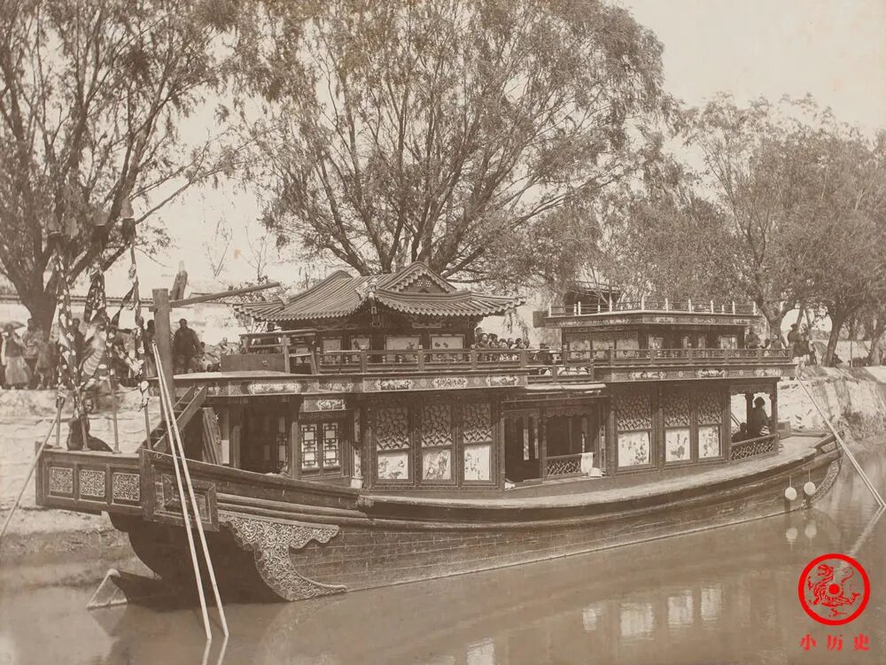 慈禧太后和光绪帝沿皇家御用河道——长河乘船进入颐和园,在船上还可以欣赏两岸“十里青山行画里,双飞白鸟似江南”的秀美景色。清朝时期,严禁百姓进入长河打渔、行船。