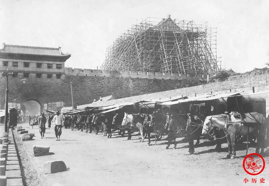 1900年义和团运动期间,正阳门箭楼和城楼均被焚毁。1901年开始重建,施工进度十分缓慢,直到1906年才竣工。瓮城闸楼外的马车依次排列,整整齐齐,各安其位,实在出人意料。
