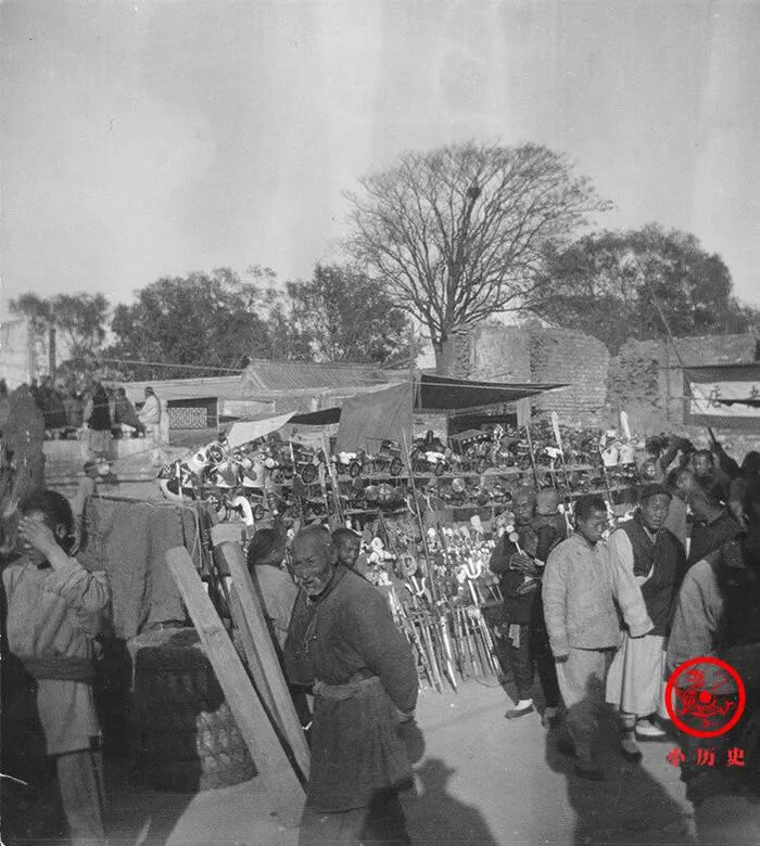 镜头前的摊位是卖玩具的,既有斧钺刀叉等“兵刃”,也有各类泥塑人物、马车等,带着浓浓的年代感。