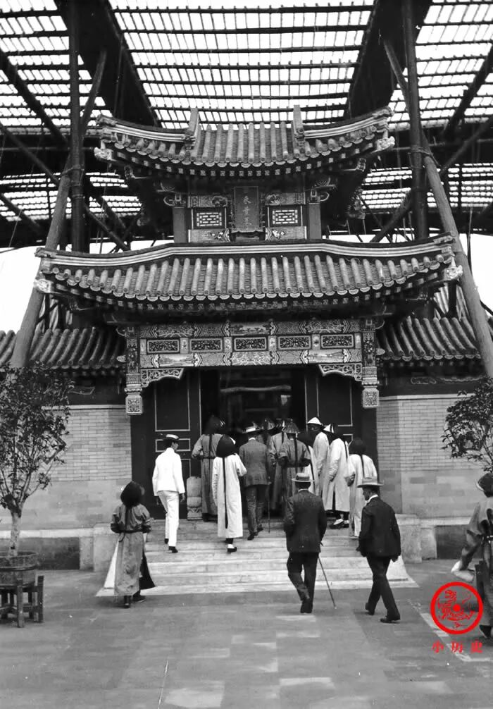 这张照片的拍摄背景是:1905年9月,美国总统罗斯福的女儿爱丽丝等人访问中国,14日,慈禧太后和光绪帝在仪鸾殿接见了他们。照片中的场景正是爱丽丝一行人在太监的引导下进入仪鸾殿。会见结束后,爱丽丝在日记中称慈禧太后“精干、敏锐和威严”,光绪皇帝却“目光呆滞”。