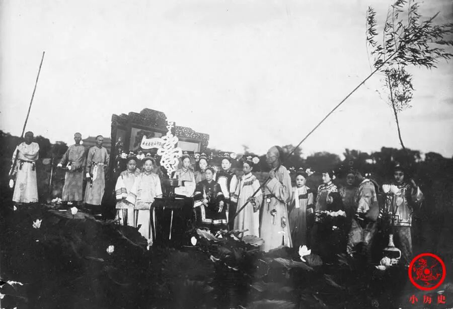 这张照片揭示了慈禧太后休闲生活的一个瞬间,她坐在小船上,身边有众多宫女和太监陪伴,其中肩扛竹子的那个人就是总管太监李莲英。太后晚年大部分时间在颐和园和西苑居住、理政,因为这两处地方风景如画,比紫禁城舒适多了。