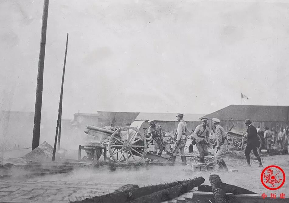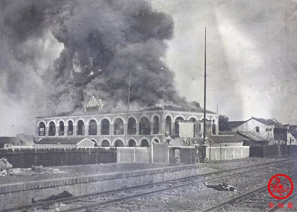 汉口火车站附近的建筑在清军的轰炸下起火。