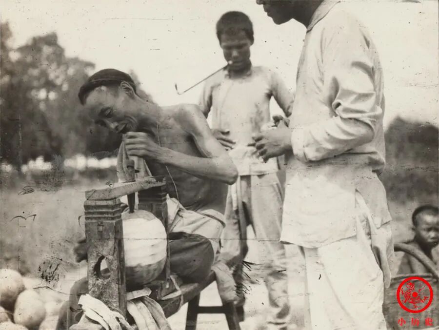 这位农民制作了一台简单的工具,更方便地削西瓜皮。削下来的薄皮不是扔掉,而是晒干后进行腌制,加工成咸菜。瓜皮舍不得扔,可谓物尽其用,这在粮食匮乏的时代是常见的现象。