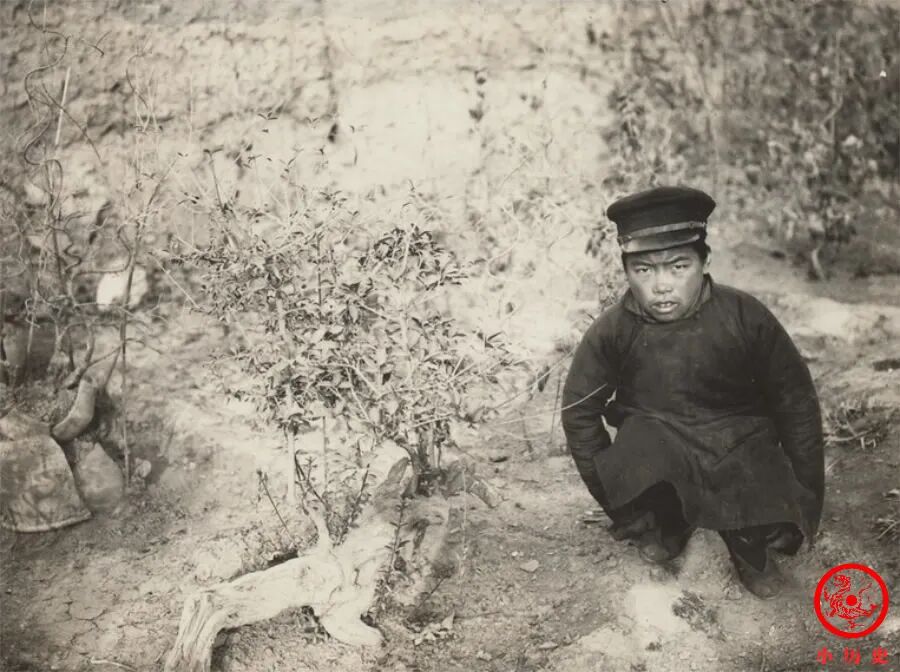 这个少年戴大盖帽,很可能是民国初年官办学校的学生。他面前的小树是一颗女贞,上面嫁接了茶橄榄。或许这棵树就是他在上学期间的研究对象。