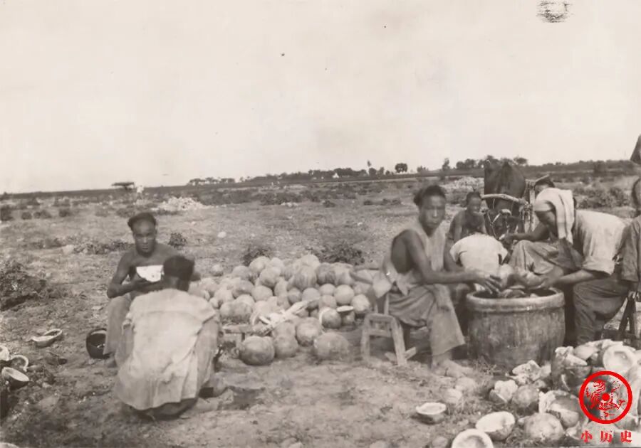 这张照片与上一张同时拍摄。农民手里的西瓜属于打瓜品种,它含籽量多,瓜瓤口感不太好,栽培这种瓜主要是为了收瓜子。农民们将瓜用拳头打破(“打瓜”一词之由来),取出籽粒,用水洗净,晒干,调味炒制,即可上市销售。迈耶记录说,这些瓜子125磅(约56.7公斤)才卖0.7美元,那是相当便宜。