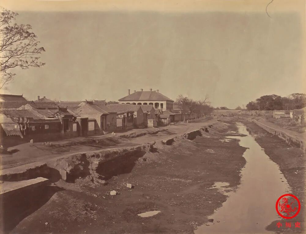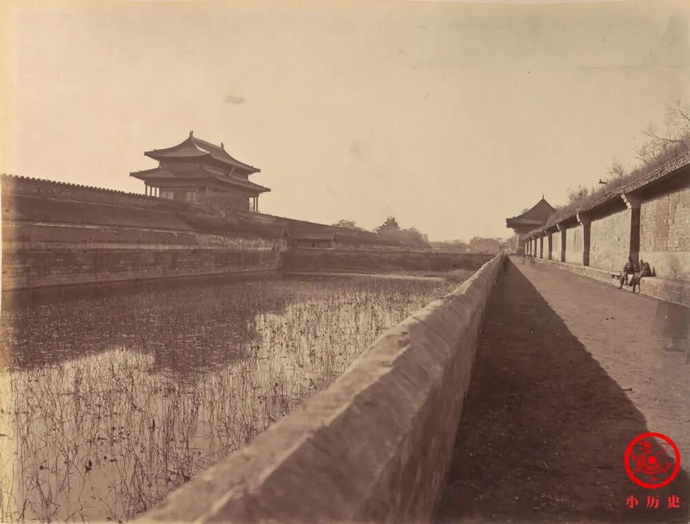 镜头前的小水沟就是御河,一条流经皇城的人工运河。清朝文献《宸垣识略》描绘御河两岸景色道:“两岸俱植柳,垂荫水面……水绕沙堤曲,桥看御柳眠。柔条轻着雨,嫩叶暗抽烟。影落澄波细,阴垂画槛偏。亭亭依汉苑,迟日待莺迁。”但就照片中看,御河两岸不仅不美,反而光秃秃的,很荒凉。