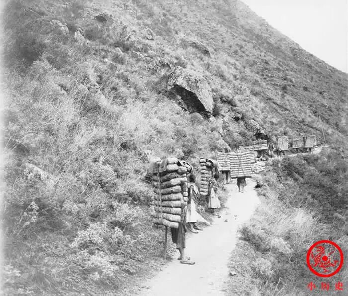 茶马古道是我国西南地区以茶马互市(出卖茶叶,购买战马)为主要内容的古代商道,明清时期特别兴盛。到晚清,马匹买卖衰落,茶叶贸易大幅度增长。照片中,茶商背着沉重的茶砖,排着长长的队伍,向西而去。