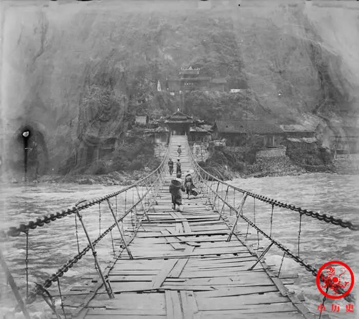 泸定桥始建于康熙年间,是一座历史悠久的古桥。全长103.67米,宽3米,由13根锁链组成。我们从照片中看到,桥下激流滚滚,桥面只简单地铺了一层木板,走在上面摇摇晃晃,让人心惊胆寒。1935年,因为红军“飞夺泸定桥”战斗,这座桥由此闻名中外。