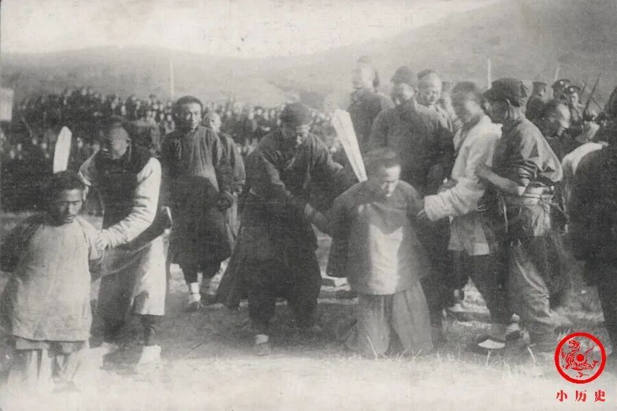 两个囚徒被五花大绑,跪在地上,等待着最后时刻的到来。他们身后围满了黑压压的人群,伸长了脖子看行刑一幕。封建朝廷认为,公开行刑能起到教化、震慑的作用,实际上这是不文明的表现。