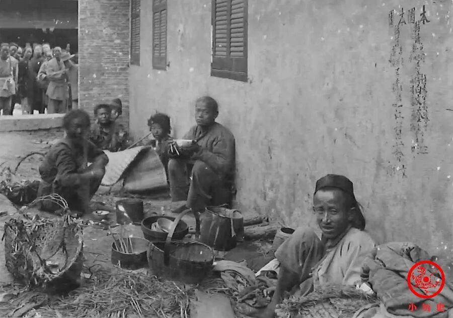 这一家人遭遇灾殃,失去家园,老老小小流落街头,做起了乞丐流民。他们所有的家当不过是水桶、碗筷、草席之类的,手里的饭也是刚刚乞讨来的,境况凄惨至极。在晚清各地街头,这样的情况并非罕见。