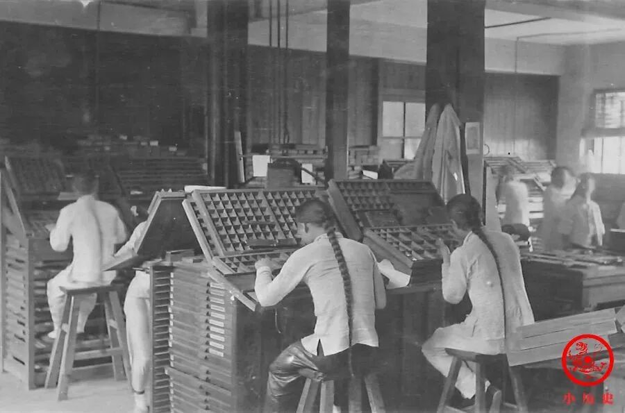 排字工人正在埋头苦干,他们面前的字架层层叠叠,要完成一本书的排印须完成不小的工作量。排字不是谁都干得了的,只有认识足够多的文字,才能熟练地拿取铅字,这是一个文盲或半文盲绝对做不到的,所以排字工被尊称为“排字先生”。