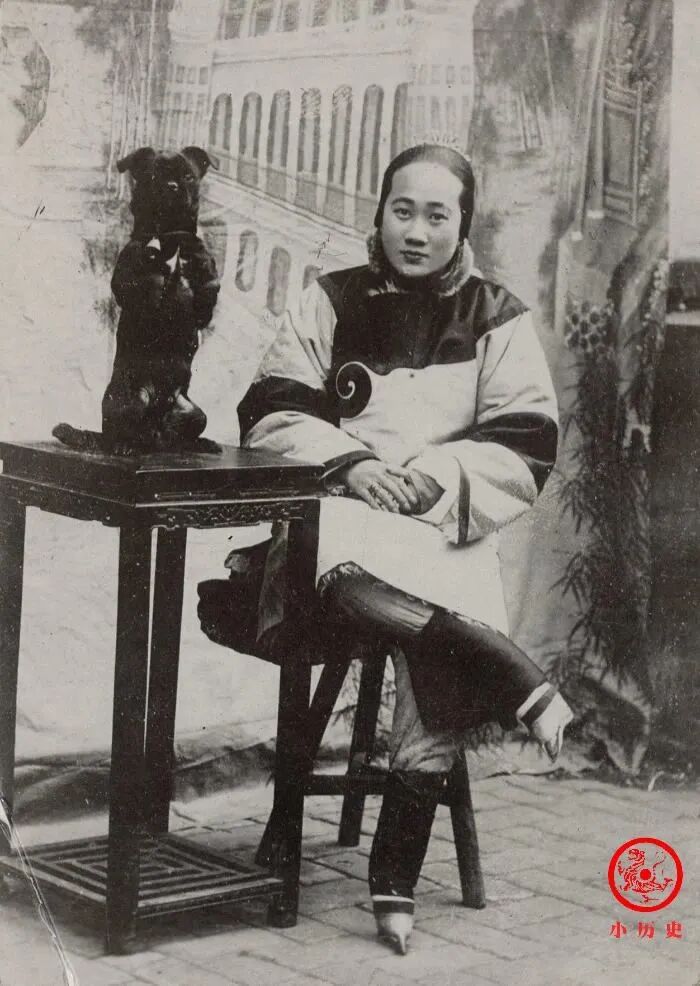 这位妇女衣着亮丽,跷着二郎腿,坐在照相馆里拍照,脸上露出自信的表情。可以肯定地说,她的“三寸金莲”是她值得骄傲的资本之一,整个社会都以畸形的小脚来评判一个女人的美丑。在茶几上蹲着的那只狗,是木偶玩具,还是真狗?