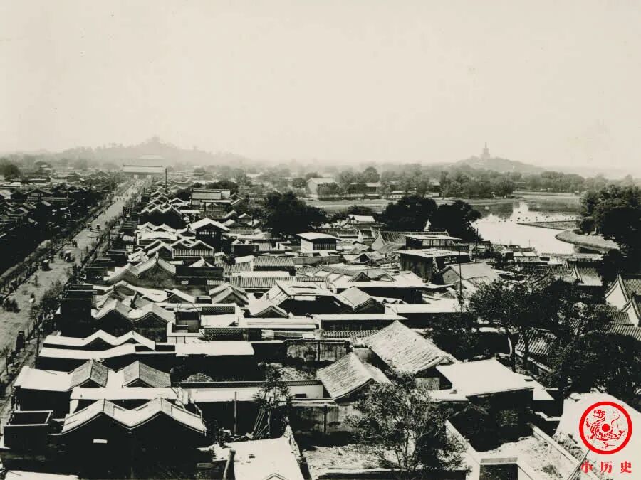 从这个角度看老北京,确实比较少见。除了鳞次栉比的房屋,我们还可以清晰地看到地安门、景山、北海白塔。画面右侧的那一片水域,属于什刹海的一部分。你还能发现其他有价值的细节吗?