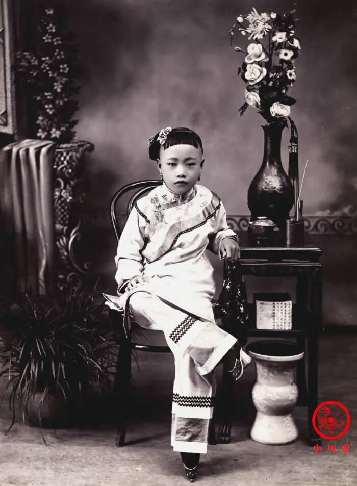 这位千金小姐衣装精美、化妆精致,衣服上的纹饰显示着她非富即贵的家庭条件。也许你觉得她的发型、她的小脚都不好看,但在她生活的那个年代,她是无数年轻女子模仿的时尚楷模,也是很多年轻男子追慕的对象。我们现在看来,她小小年纪,双足被裹成了“三寸金莲”,一辈子无法奔跑跳跃,实在令人痛心。