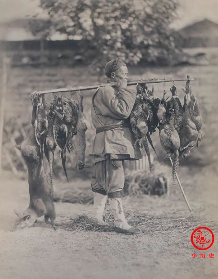 这个个头不高的男子兼具猎人与商贩双重身份,自己捕获小动物之后,再扛出来出售。他的扁担上挂着山鸡、兔子,最左侧那只四足动物不认识。提醒各位,现在千万不要去捕猎野生动物,更不要食用。