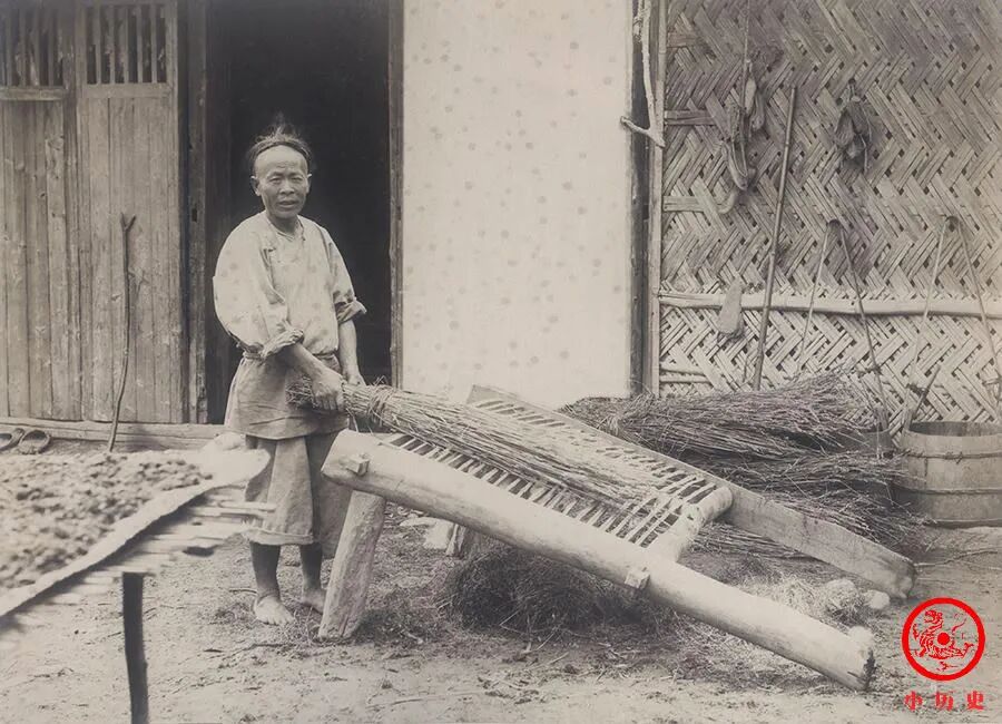 秋天,水稻成熟,农民将从田里收割下来的一捆捆水稻在特制木架子上摔打,谷穗就掉到了地上。再对谷穗进行几次加工,就获得大米了。没有农业机械的年代,所有的工具都那么简陋,干农活全凭力气。