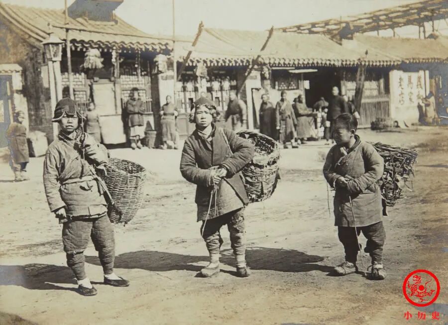 三个少年分别背着箩筐,不知道在做什么事,显然是为生计奔波。
