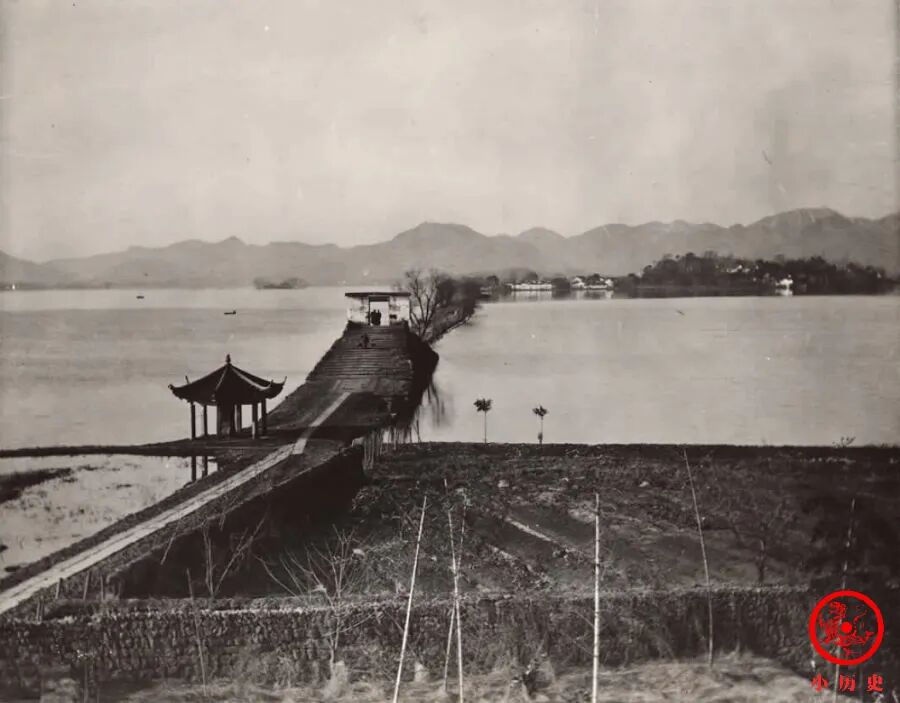 晚清的断桥与现今在细节上有比较大的不同,画面中“断桥残雪”碑亭在路南,而现在的位置在路北。那时候桥上还建了一道门,每天定时启闭,限制着人们进入白堤的时间。桥头似乎有人开辟了一块菜地,看来官府对西湖风貌没有整体的管理规划。