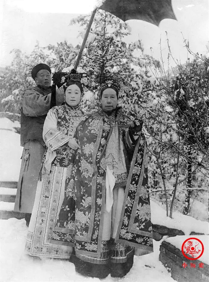 下雪天,颐和园里银装素裹,慈禧太后在德龄和大太监崔玉贵的陪伴下游园赏梅,并饶有兴致地在一棵梅花前留影。她顺手把一枝梅花拉到自己面前,人与花相映,与当今老太太在景区拍照毫无二致。