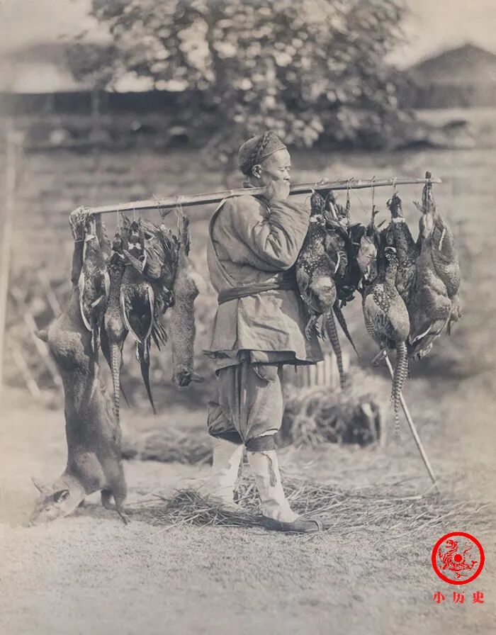 男子进山打猎,捕获很多山鸡、兔子等野味,扛出来出售。扁担上挂着的那些小动物,在今天都受法律保护,大家休想去捕猎,更不要购买食用。