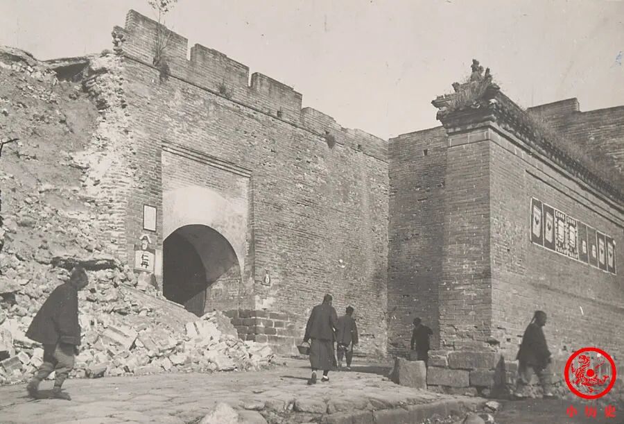 山海关城墙始建于明朝,在经历了数百年风雨之后,因没有什么维修措施,到晚清时期已残破不堪,到处可见坍塌的痕迹。另外墙体上张贴着各类广告海报,透露着一点新时代的气息。