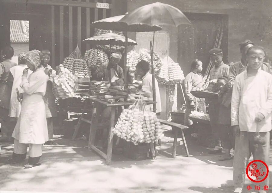 照片前景中的少年提着一只水壶,可能是店铺里的小伙计,遗憾的是他的面孔拍虚了;他的身后排列着很多摊位,尤以卖甘蔗的最多。