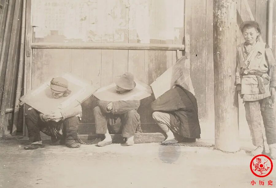 三个人分别戴着枷板,还被铁链捆在一起,很可能是卷入了同一桩案件。当摄影师准备拍照的时候,他们纷纷转过头去,不敢直面镜头,显然感到不好意思。“戴枷示众”这种刑罚不止是对身体的限制,更有对人格的羞辱,官府就是想通过激发囚徒的耻感,从而避免他再次犯法。