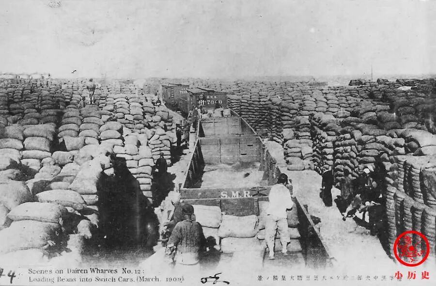 这张照片拍摄于1909年。东北是中国大豆的主产区,当时年产量大约有150万吨,1909年出口量超过80万吨。甲午中日战争之后,日本在东北势力的不断扩张,开始了对东北大豆的控制,其通过“满铁”等机构的经营,使东北大豆成为重要的战略物资,从中获取暴利。