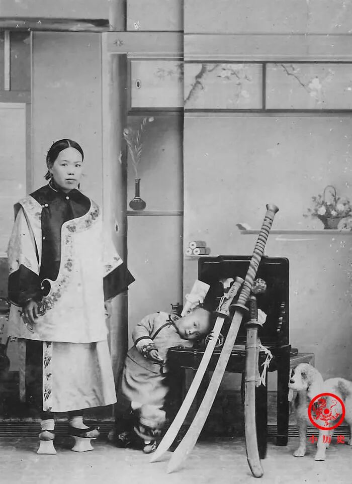 这张照片的结构布局很有意思,在最显眼的位置摆放了3把大刀,突出了旗人家庭的尚武传统。