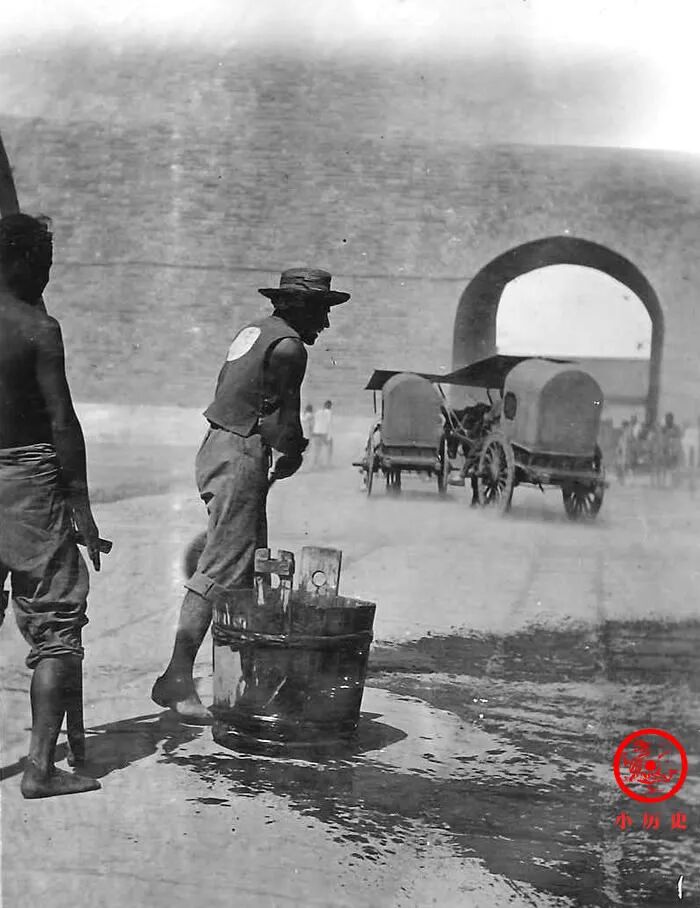 这张照片拍摄于1907年。100多年以前北京城的道路都是由黄土混合沙石碾压筑成,在刮风的时候,尘土飞扬,路面被车轮碾压破坏,坑坑洼洼。所以要用黄土铺垫修整道路,再泼上净水,减少扬尘。泼街时两人一组,分上下手,持勺泼水的上手工钱挣得多点儿,下手帮忙抬双耳大木桶。泼水也讲技巧,既要泼得远更要泼得匀,把这条街泼得又湿又匀,还不能和泥。